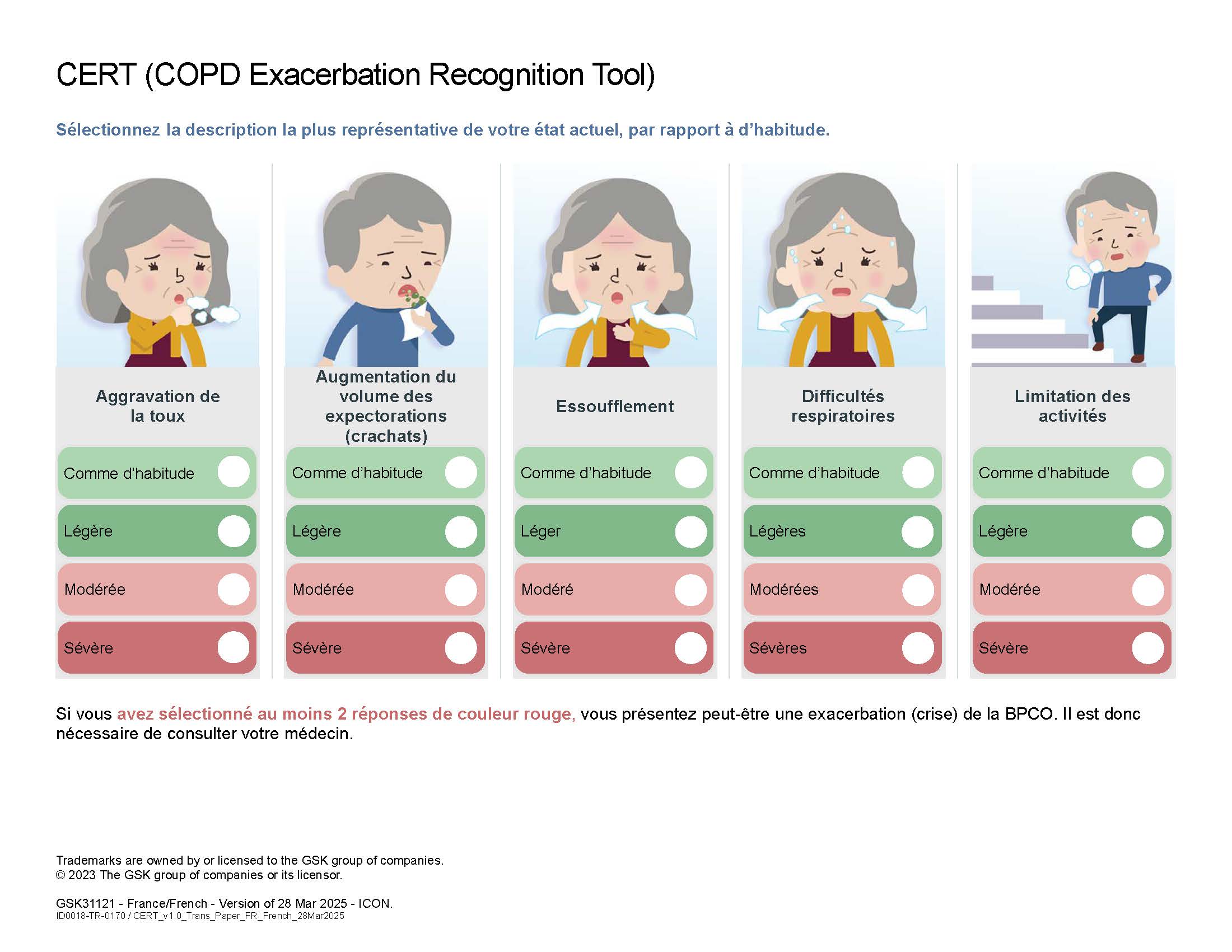 Au cours du programme d’ETP, l’un des points abordés est la reconnaissance des exacerbations pour les prendre en charge. Dans ce cadre, l’outil de reconnaissance des exacerbations de la BPCO (CERT), développé et détenu par GSK, a été créé pour vous puissiez reconnaître le début d’une exacerbation et vous rapprocher de votre médecin.